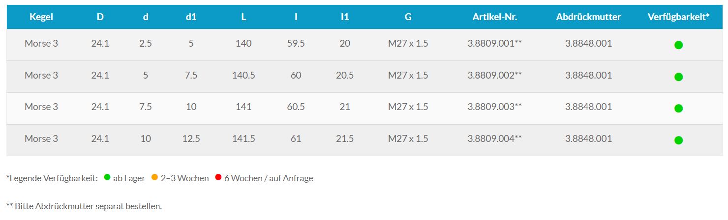 | Morse 3 | 24.1 | 10 | 12.5 | 141.5 | 61 | 21.5 | M27 x 1.5 | 3.8809.004** | 3.8848.001 | ● |