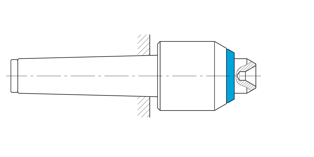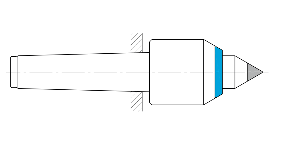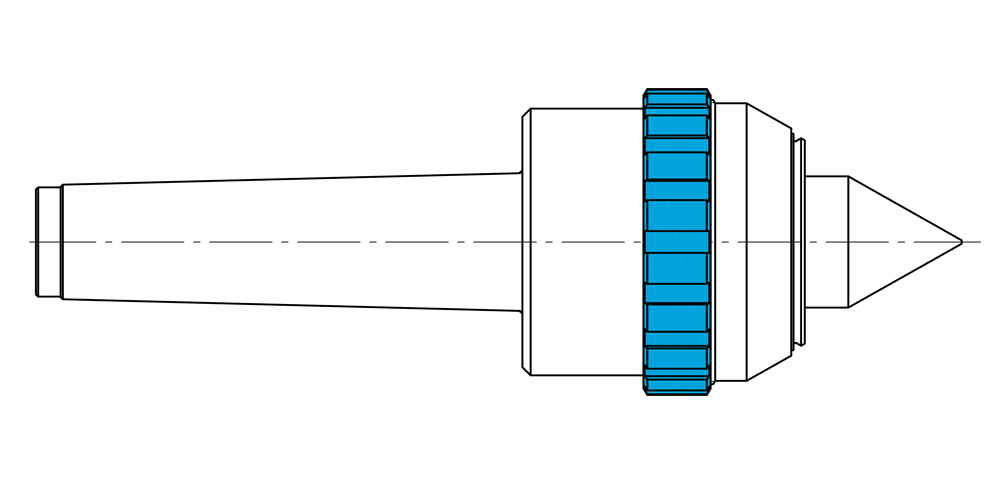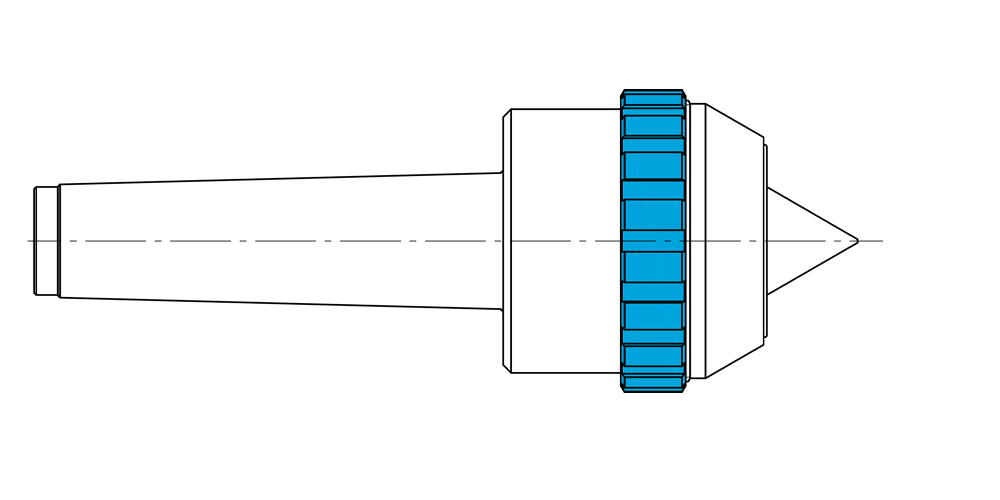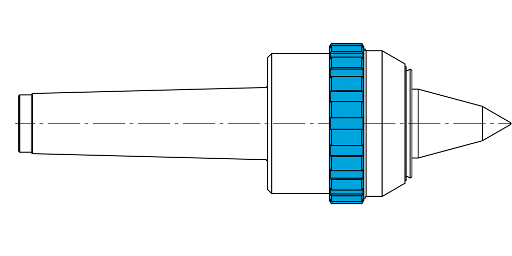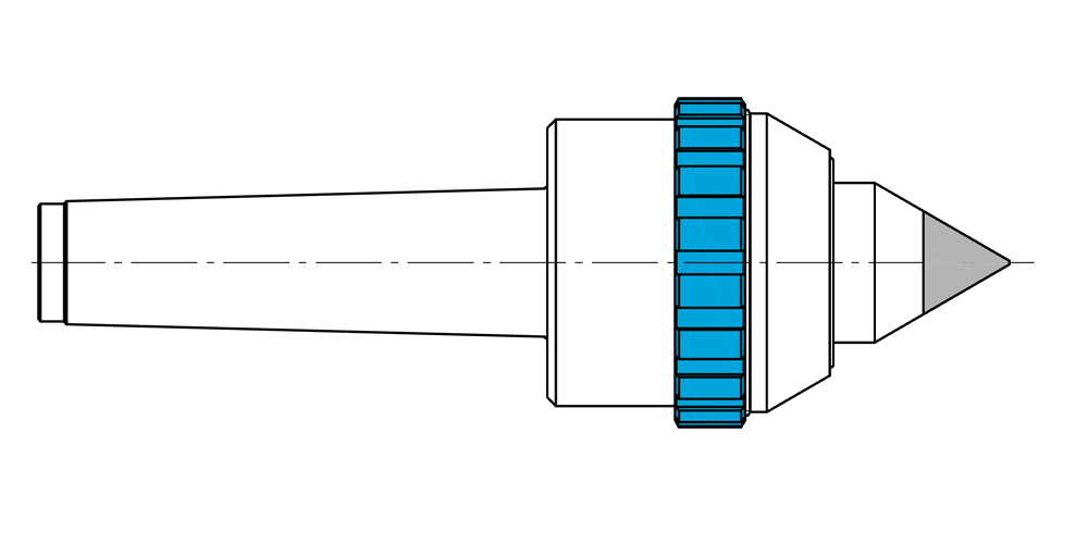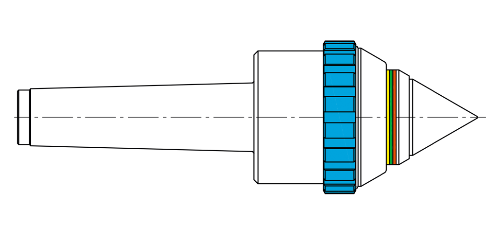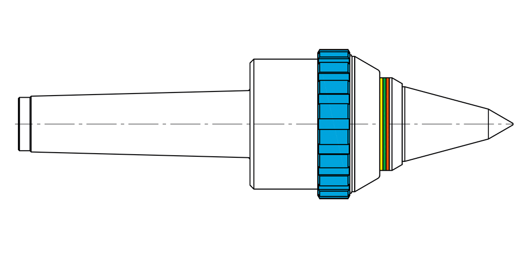 The drop-forged hardened steel shank, tapered at the front, is highly practical and accessible for all lathe work. The heavy-duty center made of high-tensile, wear-resistant alloy steel is through-hardened and can be reground as required. To achieve greater stability and maximum rigidity the rotating center is supported by front and rear bearings. Because of the large number of rollers with low relative velocity, these precision bearings are equally suited to both high-speed operations and heavy duty applications. The pressure relief automatically compensates any thermal expansion of the workpiece during the machining process. This feature protects the bearings in the live center as well as the machine bearings.