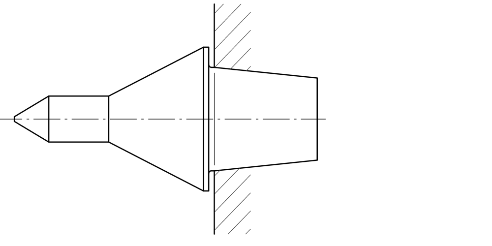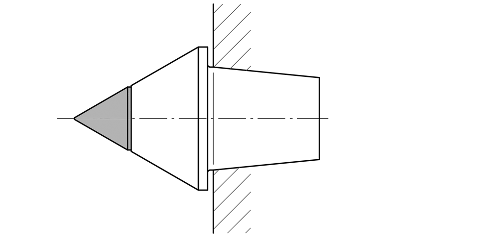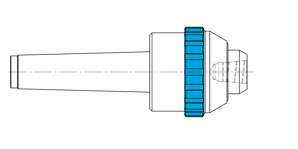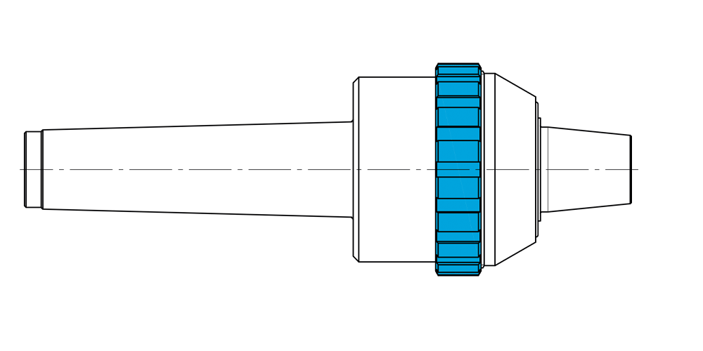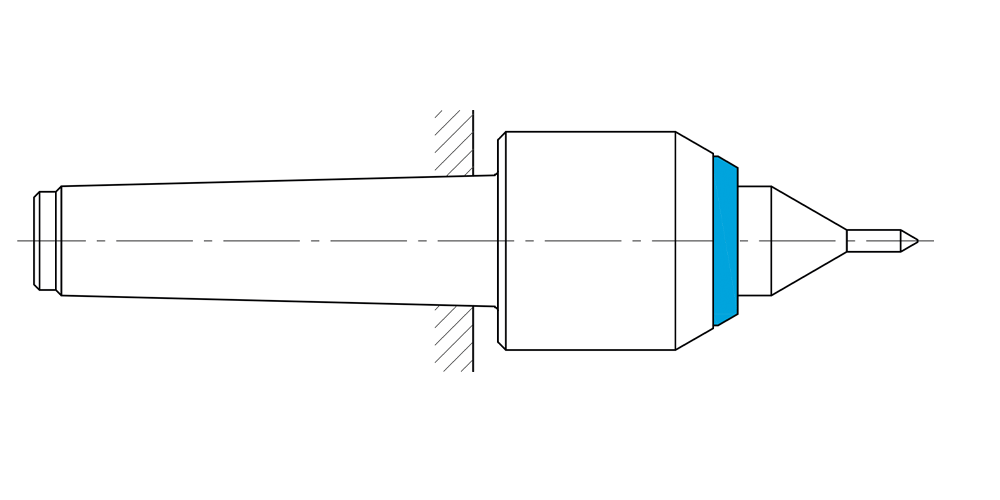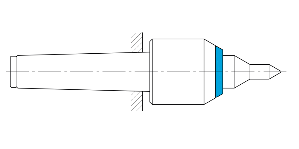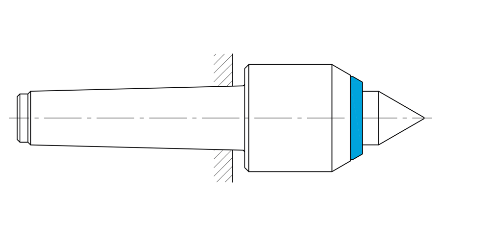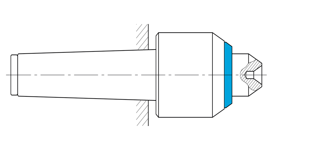 The drop-forged hardened steel shank, tapered at the front, is highly practical and accessible for all lathe work. The heavy-duty center made of high-tensile, wear-resistant alloy steel is through-hardened and can be reground as required. To achieve greater stability and maximum rigidity the rotating center is supported by front and rear bearings. Because of the large number of rollers with low relative velocity, these precision bearings are equally suited to both high-speed operations and heavy duty applications. The pressure relief automatically compensates any thermal expansion of the workpiece during the machining process. This feature protects the bearings in the live center as well as the machine bearings.