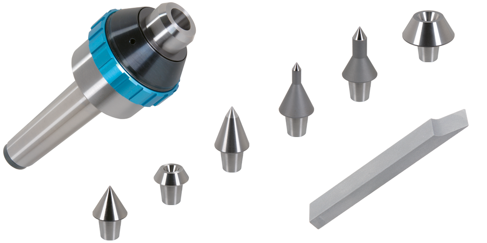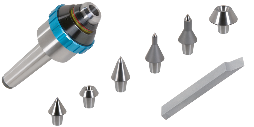 Drop-forged shank made of hardened steel. Rotating point made of through-hardened, alloy steel. Four-point support for high axial and radial loads. Concentricity 0.005 mm or better. High speeds of 10 000 RPMs. Double labyrinth seal design. No maintenance up to 2000 hours and longer service life due to lifetime lubrication of the roller bearings. These live centers are designed for CNC machine tools and copying lathes with hydraulic tail -stocks as well as for machining workpieces with small center holes, and precision machining at ultrahigh speeds.